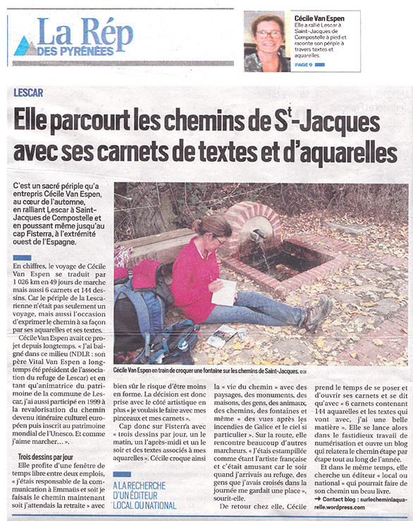 Car, j’ai vécu l’aventure du Chemin, de Lescar (64 – France) où je réside, jusqu’à la fin des terres via Compostelle. Aussi, dans mon sac à dos, tout le matériel de l’aquarelliste. Et, à raison de 2 à 3 aquarelles peintes par jour, je suis revenue avec 144 aquarelles. Aussi, vous pouvez les retrouver dans un carnet d’aquarelles. Egalement, en parallèle, j’ai relaté mon aventure sur un blog dédié. Donc, retrouvez mon aventure en suivant le lien ci-après : Sur le Chemin… l’Aquarelle.